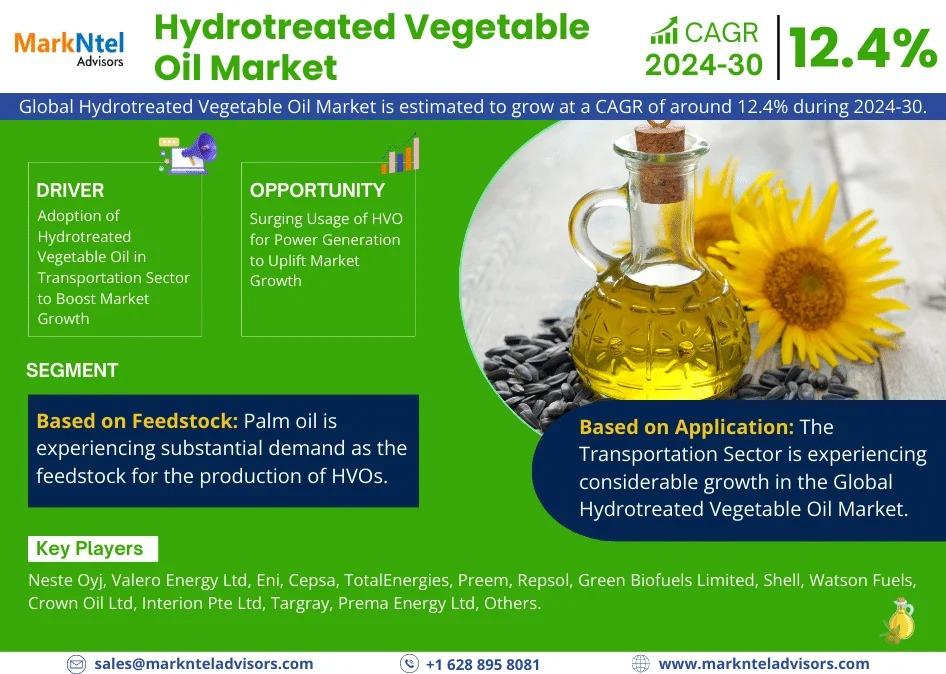MarkNtel Advisors, a leading market research and consulting firm, has announced the release of its latest study titled Hydrotreated Vegetable Oil (HVO) Market Research Report: Forecast (2024–2030). This report provides a detailed assessment of the Hydrotreated Vegetable Oil (HVO), covering its evolving dynamics, emerging trends, key growth drivers, major challenges, and competitive landscape.