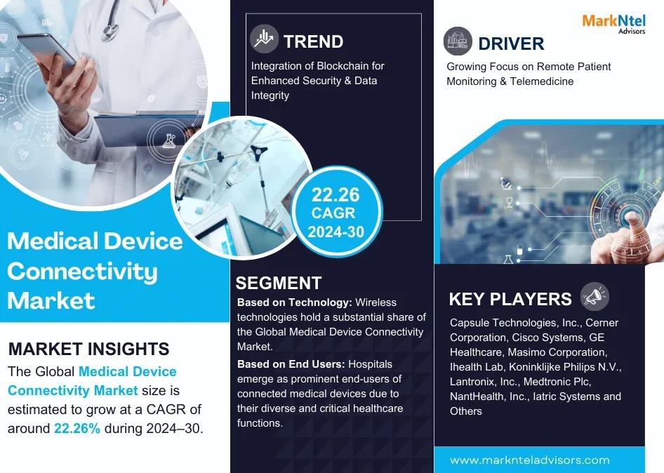MarkNtel Advisors, a leading market research and consulting firm, has announced the release of its latest study titled Medical Device Connectivity Market Research Report: Forecast (2024–2030). This report provides a detailed assessment of the Medical Device Connectivity, covering its evolving dynamics, emerging trends, key growth drivers, major challenges, and competitive landscape.
