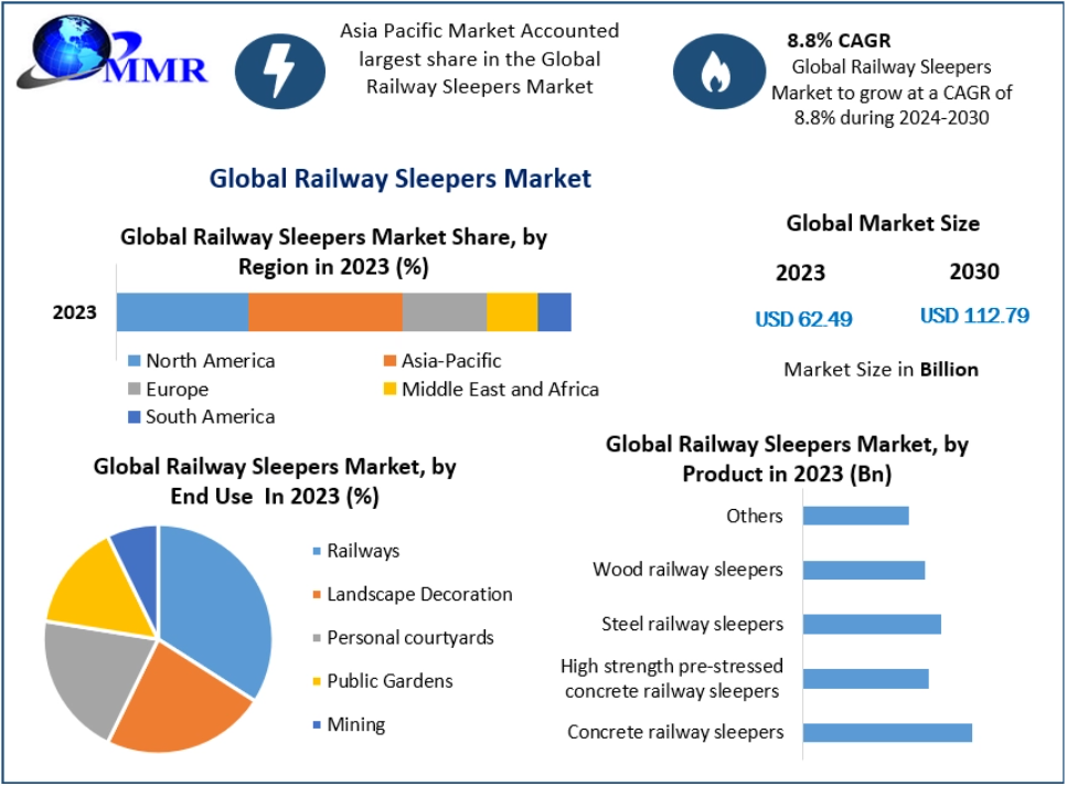 The Railway Sleepers Market is poised for significant growth, with a projected valuation of USD 112.79 billion by 2030, up from USD 62.49 billion in 2023, growing at a CAGR of 8.8% during the forecast period. Railway sleepers, also known as railroad ties, are essential components of rail tracks that provide stability, distribute load evenly, and ensure the safe operation of locomotives and bogies.