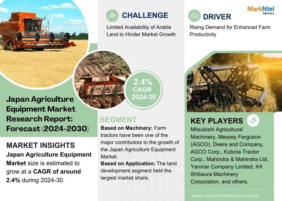 MarkNtel Advisors, a leading market research and consulting firm, has announced the release of its latest study titled Japan Agriculture Equipment Market Research Report: Forecast (2024–2030). This report provides a detailed assessment of the Japan Agriculture Equipment, covering its evolving dynamics, emerging trends, key growth drivers, major challenges, and competitive landscape.