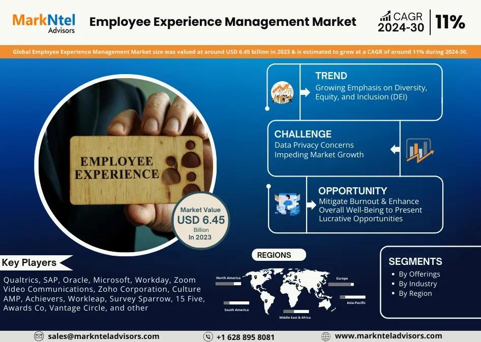 MarkNtel Advisors, a leading market research and consulting firm, has announced the release of its latest study titled Employee Experience Management Market Research Report: Forecast (2024–2030). This report provides a detailed assessment of the Employee Experience Management, covering its evolving dynamics, emerging trends, key growth drivers, major challenges, and competitive landscape.