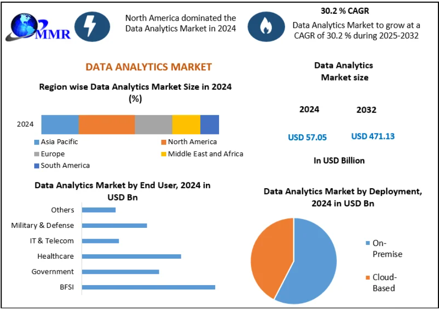 The Data Analytics Market was valued at USD 57.05 billion in 2024 and is expected to reach USD 471.03 billion by 2032, growing at a CAGR of 30.2% during the forecast period. Data analytics involves the systematic examination of raw data to uncover patterns, trends, and actionable insights that support data-driven decision-making across industries.