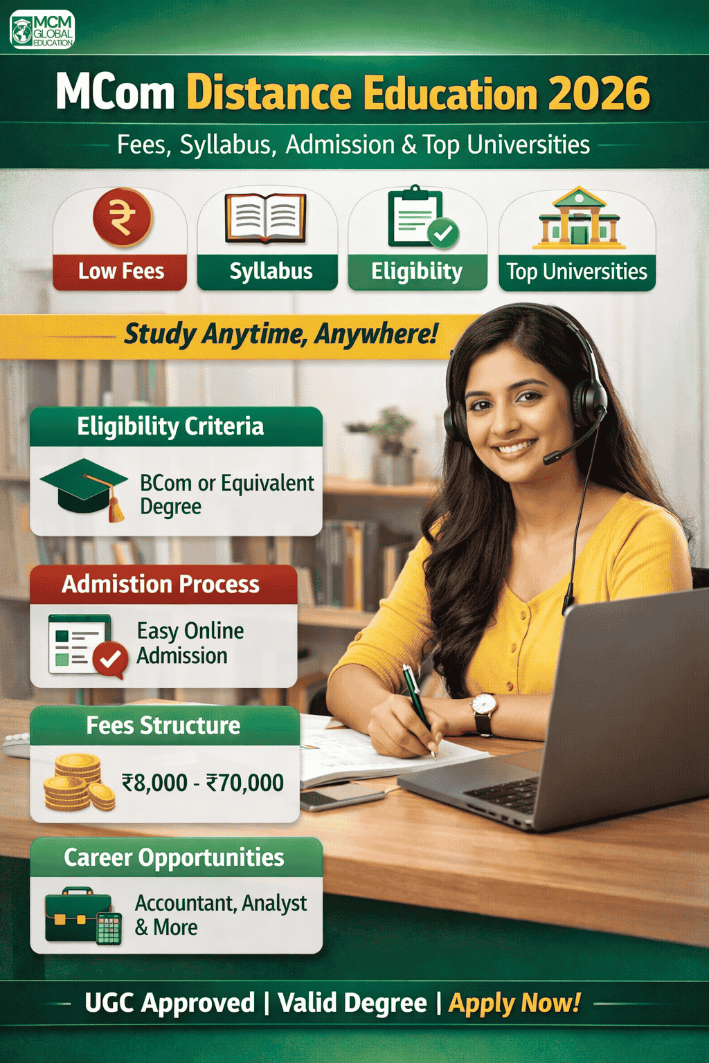 This comprehensive guide covers everything you need to know about MCom Distance Education 2026, including fees, syllabus, eligibility criteria, admission process, career scope, and top universities.