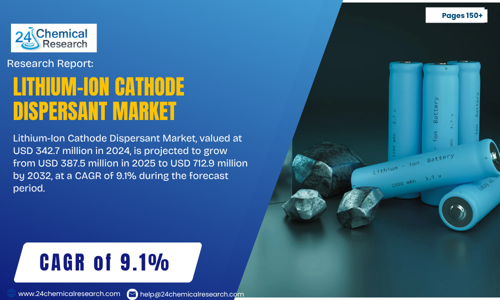 According to 24chemicalresearch, Lithium-Ion Cathode Dispersant Market, valued at USD 342.7 million in 2024, is projected to grow from USD 387.5 million in 2025 to USD 712.9 million by 2032, at a CAGR of 9.1% during the forecast period. This growth reflects the accelerating adoption of electric vehicles (EVs), rising investments in battery manufacturing, and the increasing need for high-performance energy storage solutions.