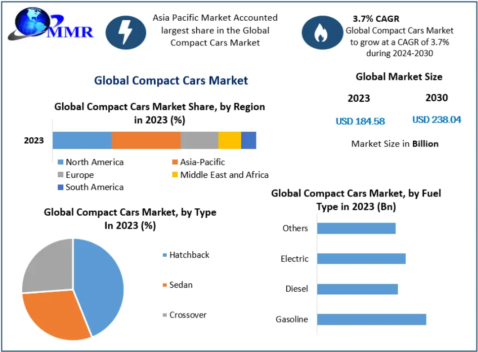 The Global Compact Cars Market is set for steady growth, valued at USD 184.58 billion in 2023 and projected to reach USD 238.04 billion by 2030, growing at a CAGR of 3.7%. Compact cars—renowned for their smaller size, fuel efficiency, and urban-friendly design—have become a go-to choice for consumers seeking practical, economical, and convenient transportation solutions.