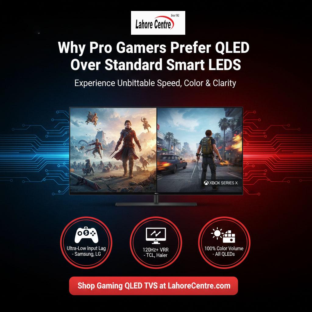 Why QLED TVs outperform standard Smart LEDs for pro gaming in 2026. Explore VRR, refresh rates, and unbeatable visuals at Lahore Centre.