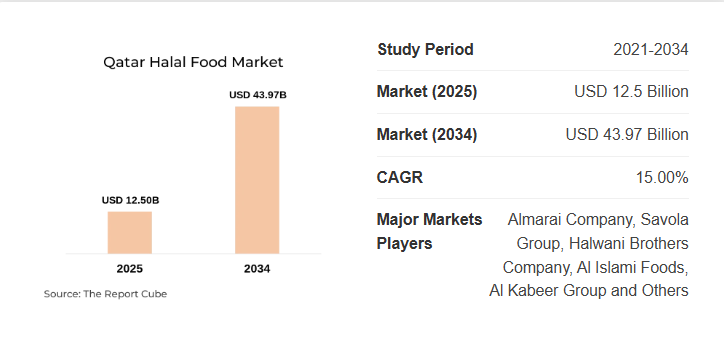 According to the Qatar Halal Food Market Research Report (2026-2034) by Report Cube, the market was valued at approximately USD 12.5 Billion in 2025. Based on current industry structure and observed demand patterns, the market is projected to reach USD 43.97 Billion by 2034, expanding at a 15.00% CAGR during the forecast timeline.