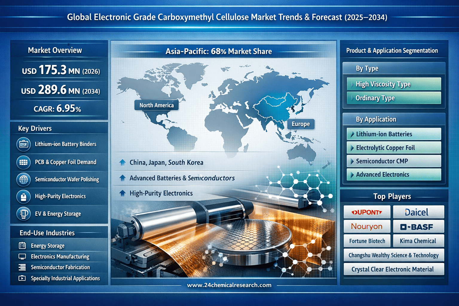 According to 24Chemical Research, Global Electronic Grade Carboxymethyl Cellulose market was valued at USD 175.3 million in 2026 and is projected to reach USD 289.6 million by 2034, exhibiting a steady CAGR of 6.95% during the forecast period.