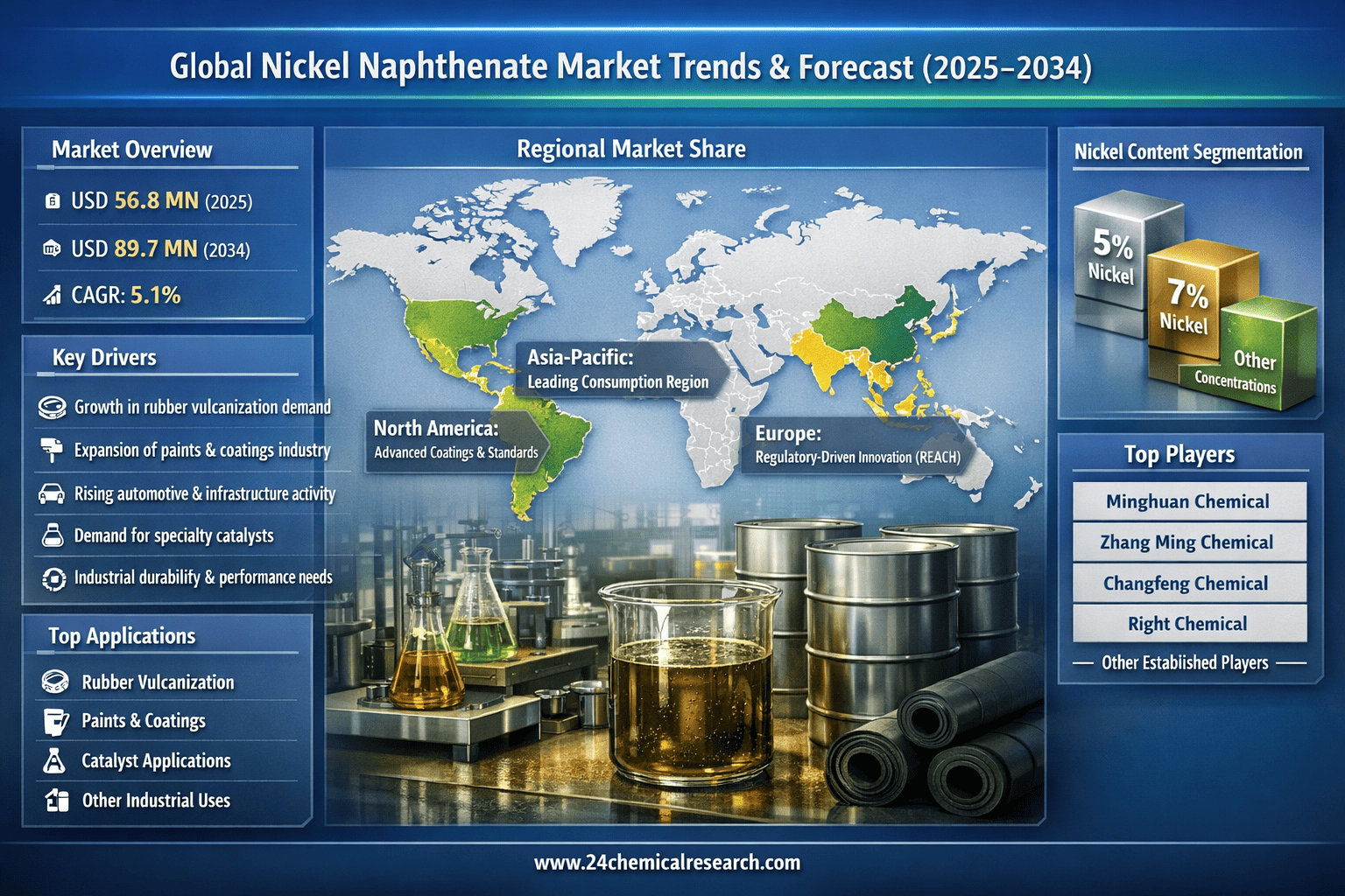 According to 24Chemical Research, Global nickel naphthenate market size was valued at USD 56.8 million in 2025. The market is projected to grow from USD 60.2 million in 2026 to USD 89.7 million by 2034, exhibiting a CAGR of 5.1% during the forecast period.