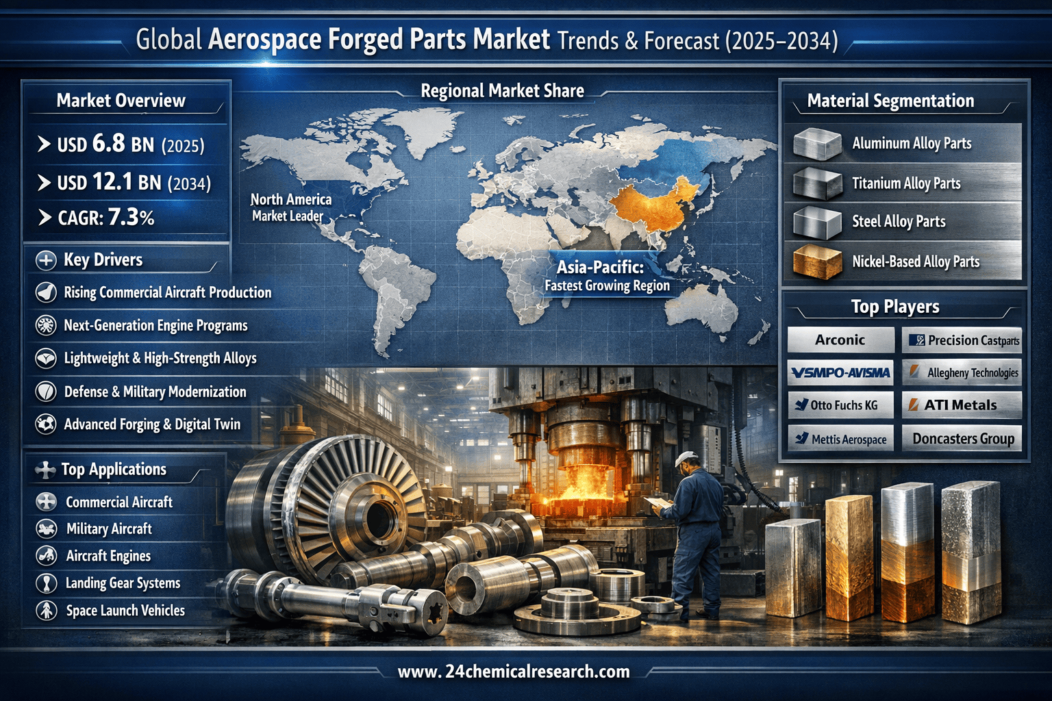 According to 24Chemical Research, Global Aerospace Forged Parts Market size was valued at USD 6.8 billion in 2025 and is projected to grow from USD 7.3 billion in 2026 to USD 12.1 billion by 2034, exhibiting a CAGR of 7.5% during the forecast period.