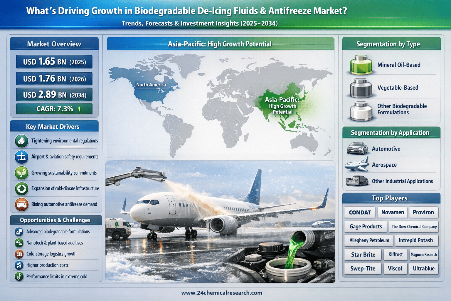 According to 24Chemical Research, Global biodegradable de-icing fluids and antifreeze market size was valued at USD 1.65 billion in 2025. The market is projected to grow from USD 1.76 billion in 2026 to USD 2.89 billion by 2034, exhibiting a CAGR of 7.3% during the forecast period.