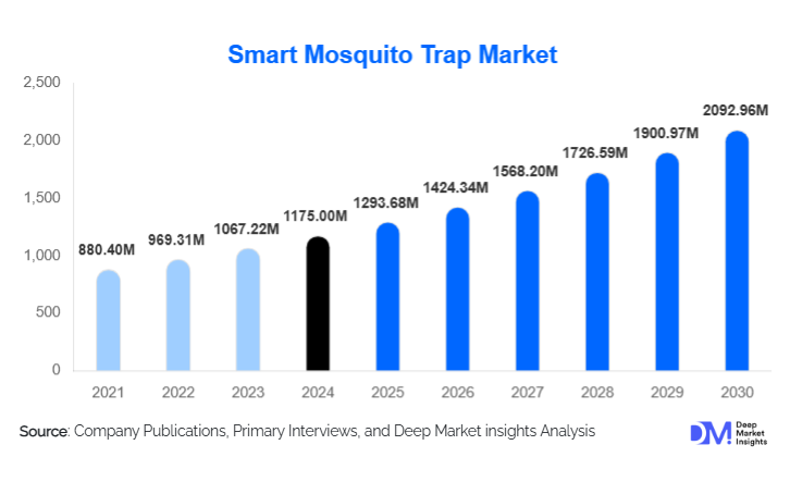 According to Deep Market Insights, the global smart mosquito trap market size is projected to grow from USD 1293.68 Million in 2025 to reach USD 2092.96 Million by 2030, expanding at a CAGR of 10.1% during the forecast period (2025–2030).