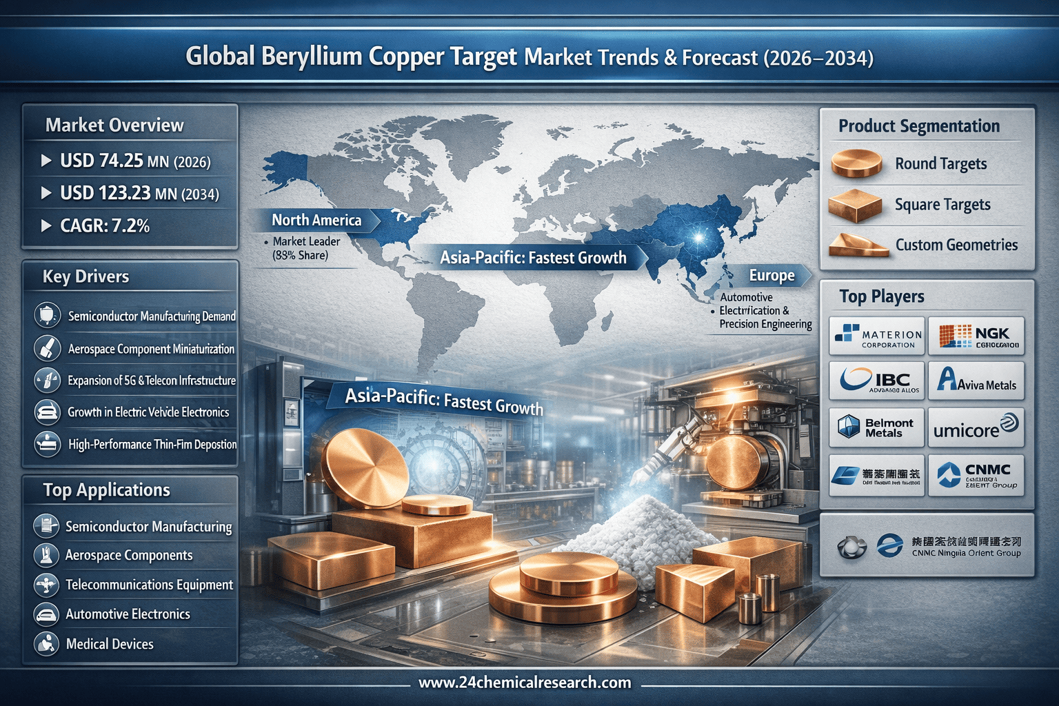According to 24Chemical Research, Global Beryllium Copper Target market demonstrates robust expansion, with its valuation reaching USD 74.25 million in 2026. According to latest industry analysis, the market is projected to grow at a CAGR of 7.2%, reaching approximately USD 123.23 million by 2034. This growth trajectory is driven by increasing applications in aerospace, telecommunications, and high-performance electronics, particularly in regions emphasizing advanced manufacturing capabilities.