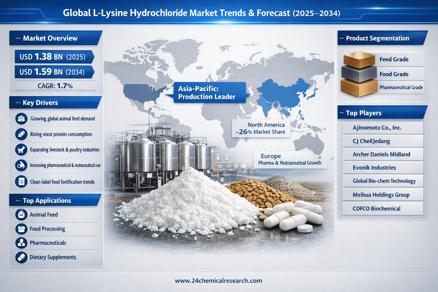 According to 24Chemical Research, Global L-lysine Hydrochloride market size was valued at USD 1.38 billion in 2025. The market is projected to grow from USD 1.42 billion in 2026 to USD 1.59 billion by 2034, exhibiting a CAGR of 1.7% during the forecast period. North America accounted for approximately 26% of global market share in 2024, with particularly strong demand from animal feed applications.