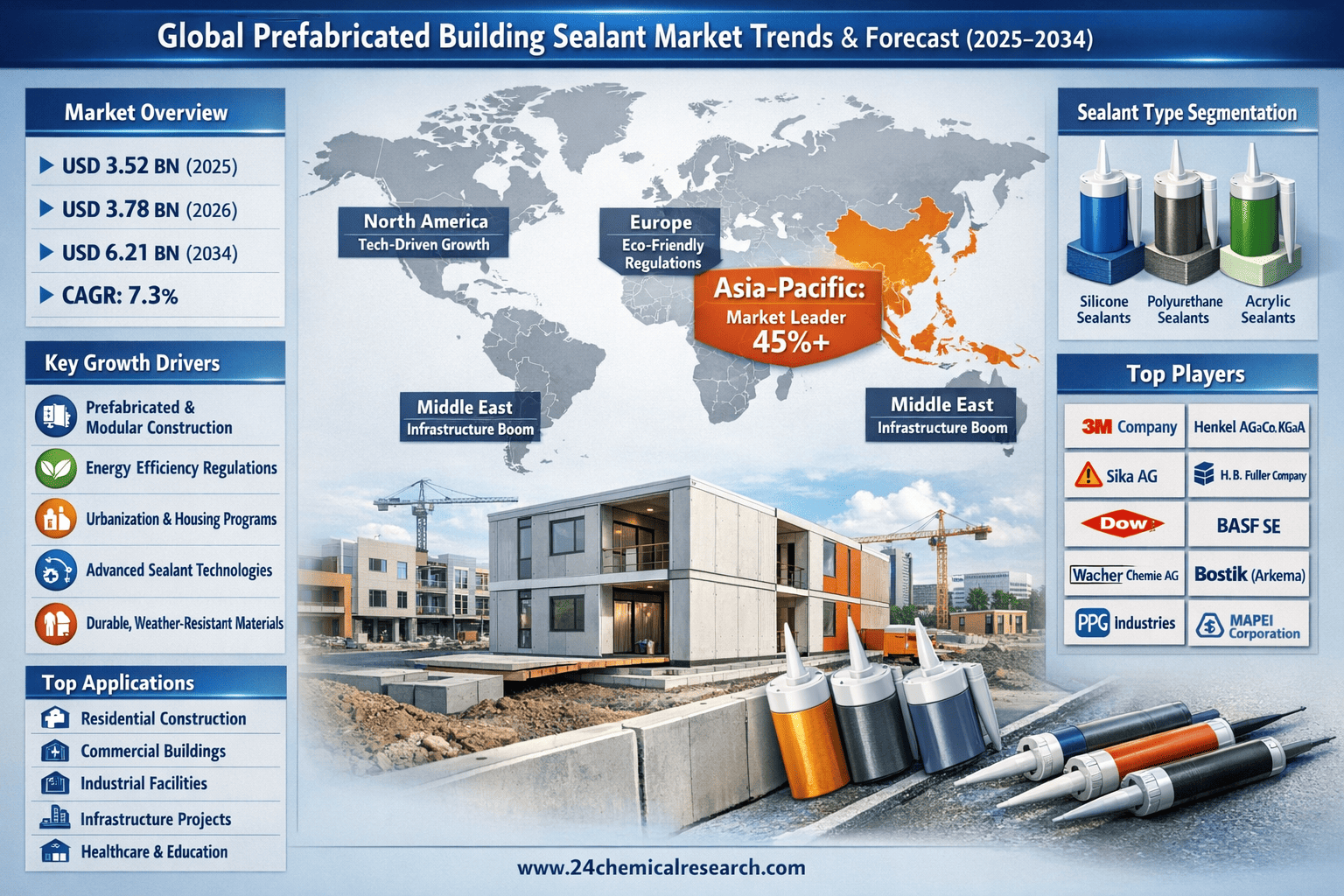 According to 24Chemical Research, Global prefabricated building sealant market size was valued at USD 3.52 billion in 2025. The market is projected to grow from USD 3.78 billion in 2026 to USD 6.21 billion by 2034, exhibiting a CAGR of 7.3% during the forecast period. While the market faces some supply chain challenges, innovative formulations and sustainable solutions are opening new opportunities across residential, commercial, and industrial sectors.