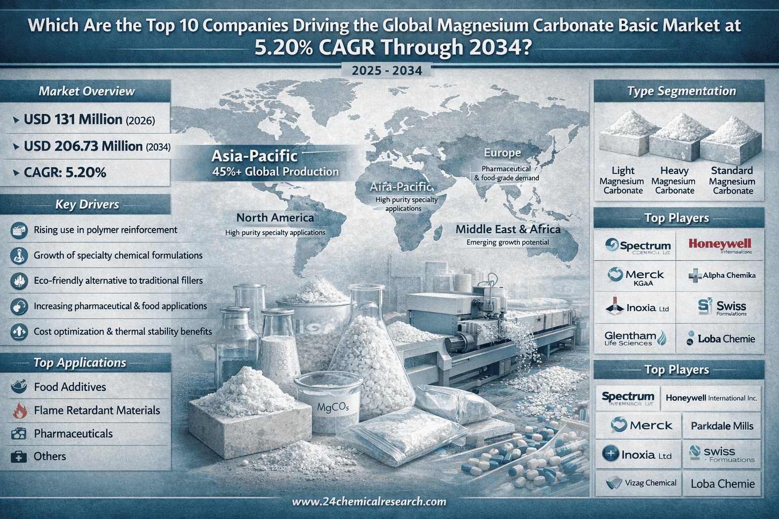 This comprehensive analysis covers the global Magnesium Carbonate Basic market landscape from 2024 through 2032, delivering critical insights across key parameters:
