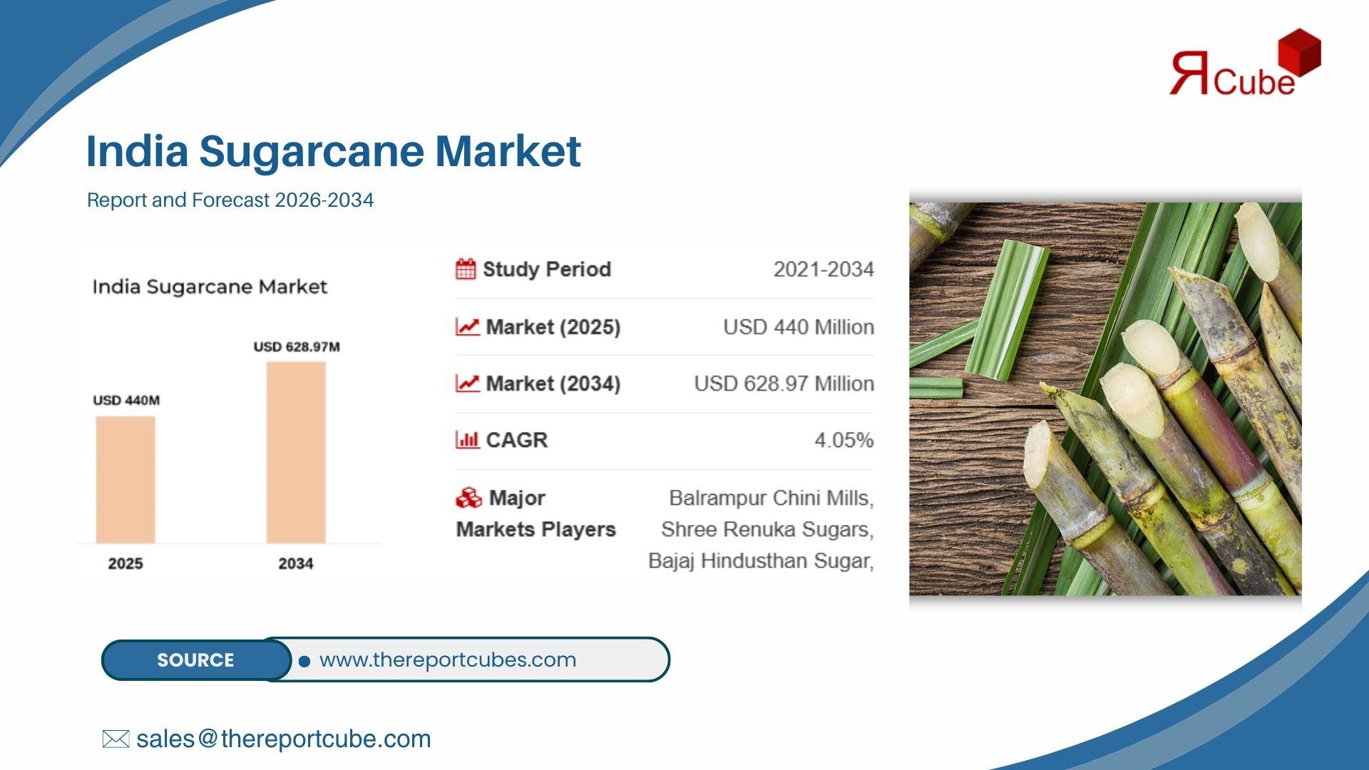 According to the India Sugarcane Market Research Report (2026-2034) by Report Cube, the market was valued at approximately USD 440 Million in 2025. Based on current industry structure and observed demand patterns, the market is projected to reach USD 628.97 Million by 2034, expanding at a 4.05% CAGR during the forecast timeline.