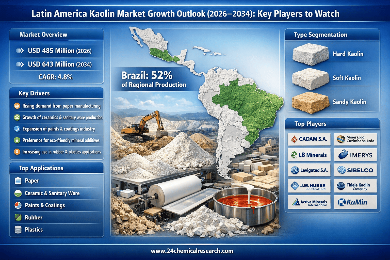 According to 24Chemical Research, Latin America Kaolin market is witnessing steady growth, with its valuation reaching USD 485 million in 2026. According to industry projections, the market is expected to expand at a CAGR of 4.8%, reaching USD 643 million by 2034. This growth is primarily driven by the increasing demand from paper manufacturing, ceramics production, and paint industries across the region.