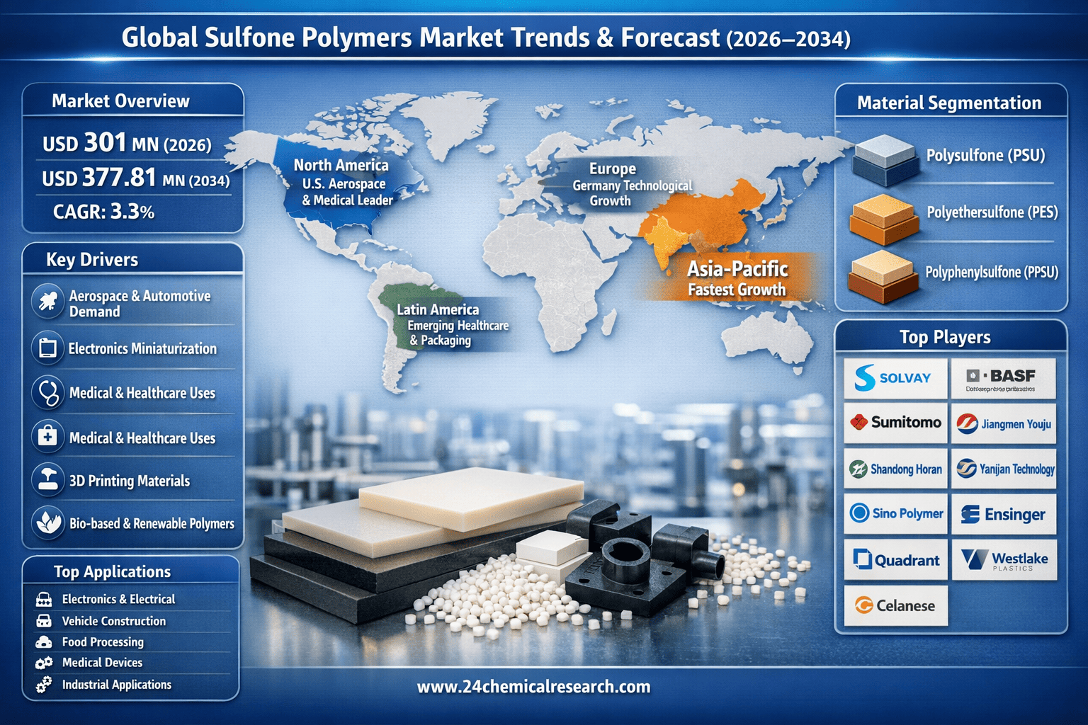 According to 24Chemical Research, Global Sulfone Polymers Market continues to demonstrate steady growth, with its valuation reaching USD 301 million in 2026. According to the latest industry analysis, the market is projected to grow at a CAGR of 3.30%, reaching approximately USD 377.81 million by 2034. This growth is largely fueled by increasing applications in automotive, aerospace, and electronics industries where demand for high-performance, durable, and heat-resistant materials continues to rise.