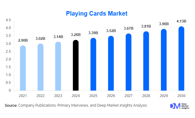 According to Deep Market Insights, the global Playing Cards Market size is projected to grow from USD 3.39 Billion in 2025 to reach USD 4.13 Billion by 2030, expanding at a CAGR of 3.98% during the forecast period (2025–2030).