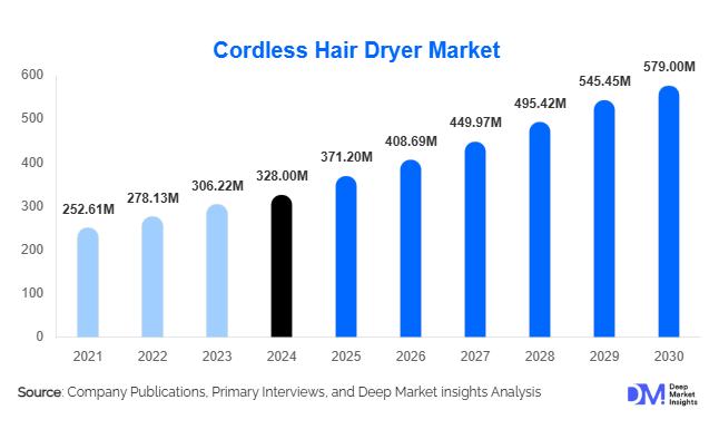 According to Deep Market Insights, the global Cordless Hair Dryer Market size is projected to grow from USD 371.2 Million in 2025 to reach USD 579 Million by 2030, expanding at a CAGR of 10.1% during the forecast period (2025–2030).