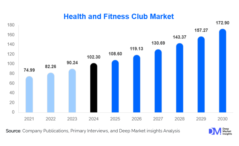 According to Deep Market Insights, the global Health and Fitness Club Market size is projected to grow from USD 108.6 in 2025 to reach USD 172.9 by 2030, expanding at a CAGR of 9.7% during the forecast period (2025–2030).