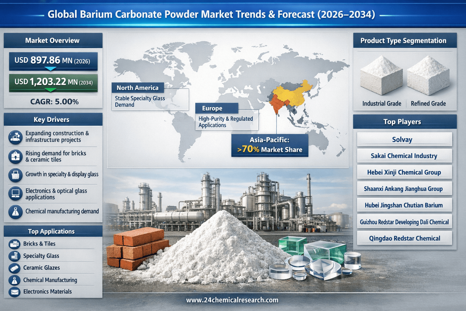 According to 24Chemical Research, Global Barium Carbonate Powder Market Size was estimated at USD 897.86 million in 2026 and is projected to reach USD 1203.22 million by 2034, exhibiting a CAGR of 5.00% during the forecast period.