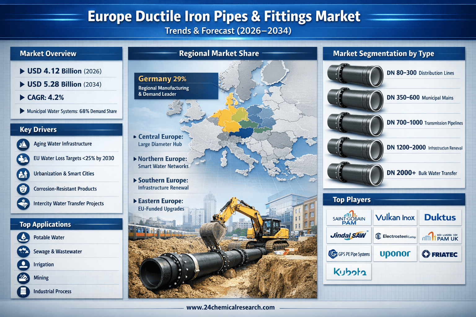 According to 24Chemical Research, Europe Ductile Iron Pipes & Fittings market continues to exhibit steady growth, with a valuation reaching USD 4.12 billion in 2026. According to recent market analysis, the sector is expected to expand at a CAGR of 4.2%, potentially reaching USD 5.28 billion by 2034. This consistent demand is fueled by the critical role these components play in modern water infrastructure systems across urban and industrial applications.