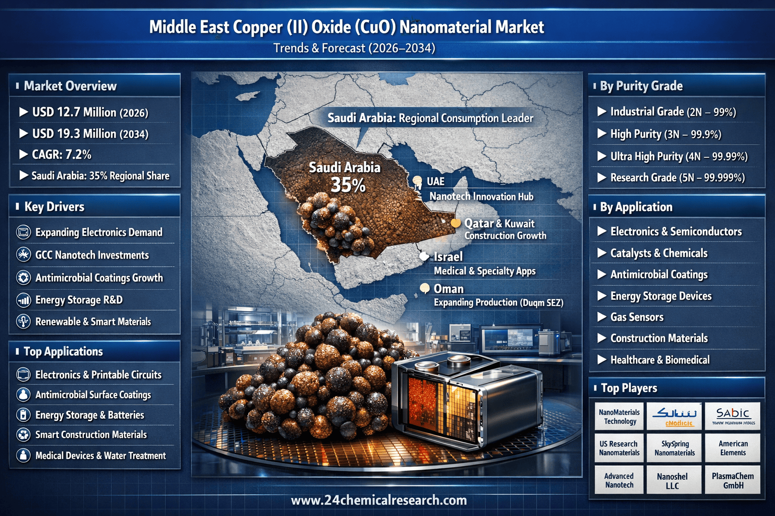 According to 24Chemical Research, Middle East Copper (II) Oxide (CuO) Nanomaterial Market demonstrates robust growth potential, currently valued at USD 12.7 million in 2026 with projections indicating expansion to USD 19.3 million by 2034, growing at a CAGR of 7.2%. This upward trajectory reflects the material's widening applications across electronics, energy storage, and advanced coatings sectors, coupled with strategic investments in nanotechnology infrastructure across Gulf Cooperation Council (GCC) nations.