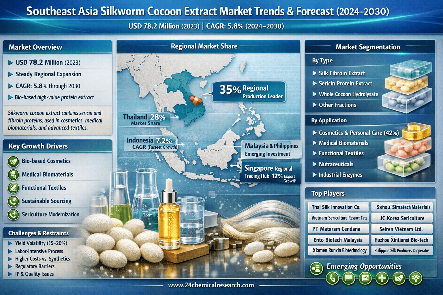 This comprehensive analysis covers the Southeast Asian silkworm cocoon extract market from 2024 to 2030, providing detailed insights into: