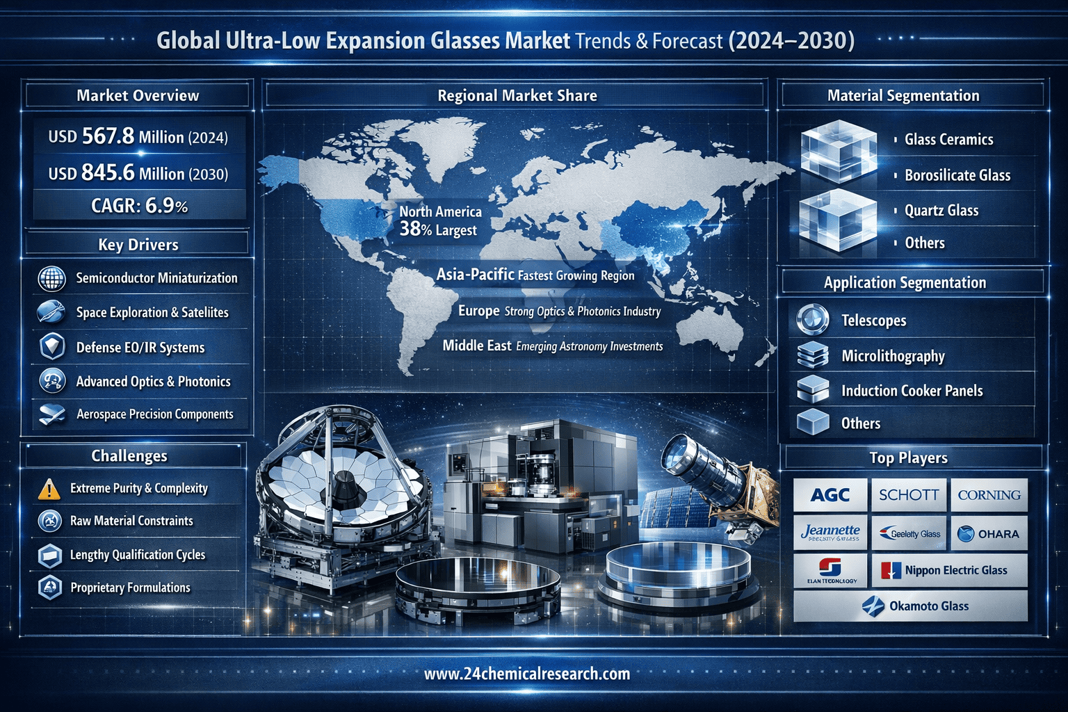 This report delivers comprehensive analysis of the global Ultra-Low Expansion Glasses market from 2024 through 2030, with detailed examination of: