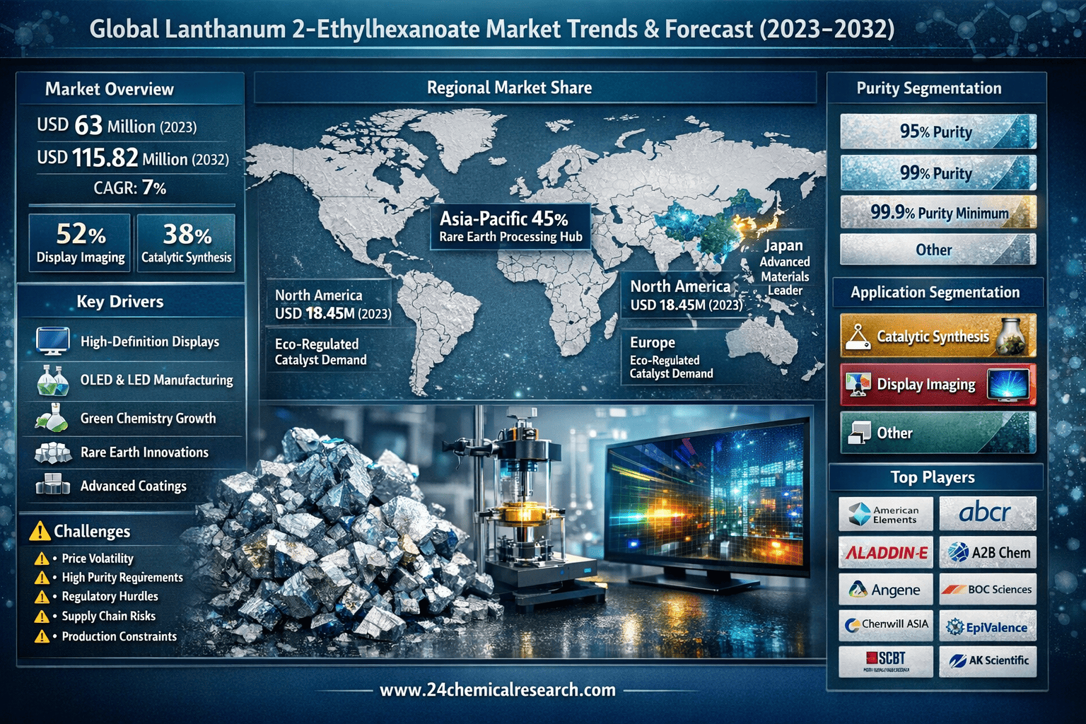 Global Lanthanum 2-Ethylhexanoate market continues to demonstrate robust expansion, with its valuation reaching USD 63 million in 2023. According to latest industry projections, the market is expected to grow at a CAGR of 7%, reaching approximately USD 115.82 million by 2032. This growth trajectory is primarily fueled by increasing applications in catalytic synthesis and display imaging technologies, particularly within advanced material science sectors.