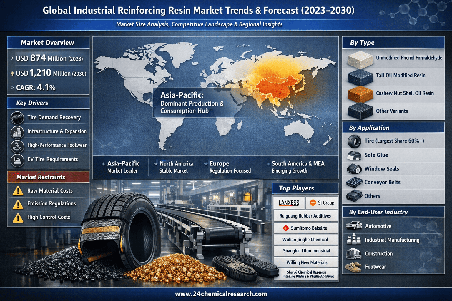 According to 24Chemical Research, Global Industrial Reinforcing Resin market was valued at USD 874 million in 2023 and is projected to reach USD 1,210 million by 2030, at a CAGR of 4.1% during the forecast period. The influence of COVID-19 and the Russia-Ukraine War were considered while estimating market sizes.