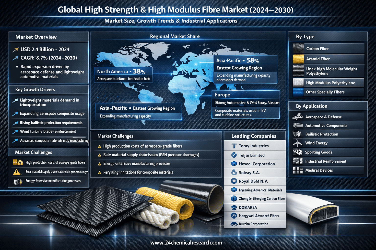 This comprehensive analysis examines the global High Strength and High Modulus Fibre market from 2024 through 2030, delivering critical insights into: