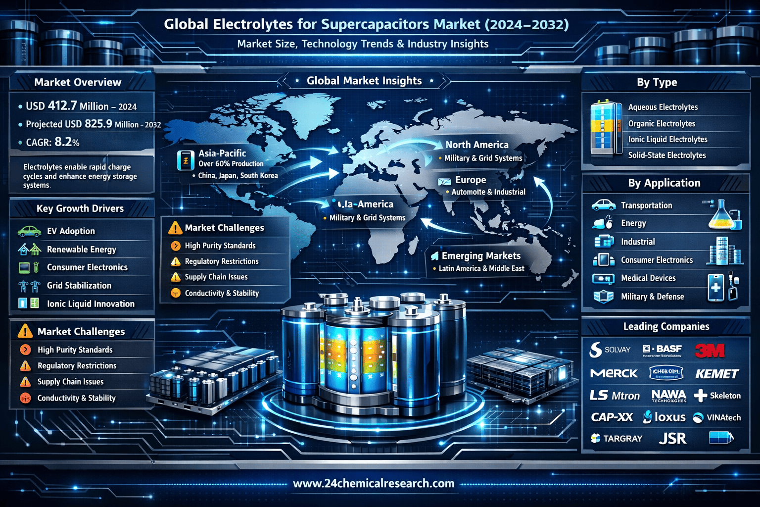 This comprehensive report provides detailed analysis of the global electrolytes for supercapacitors market from 2024 through 2032, offering insights across all key geographic regions and market segments. The study includes: