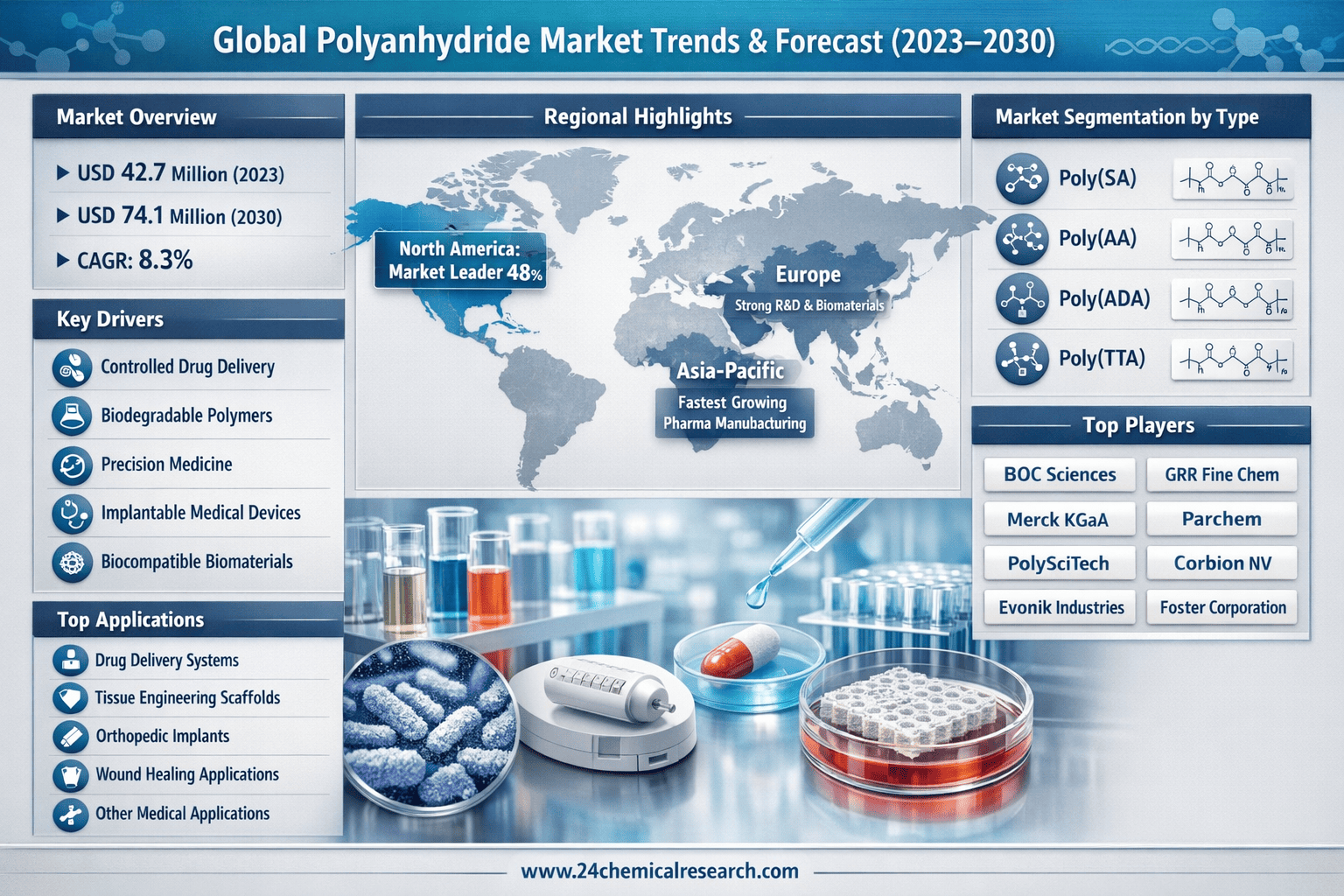 This comprehensive report provides detailed analysis of the global polyanhydride market landscape from 2024 through 2030, featuring: