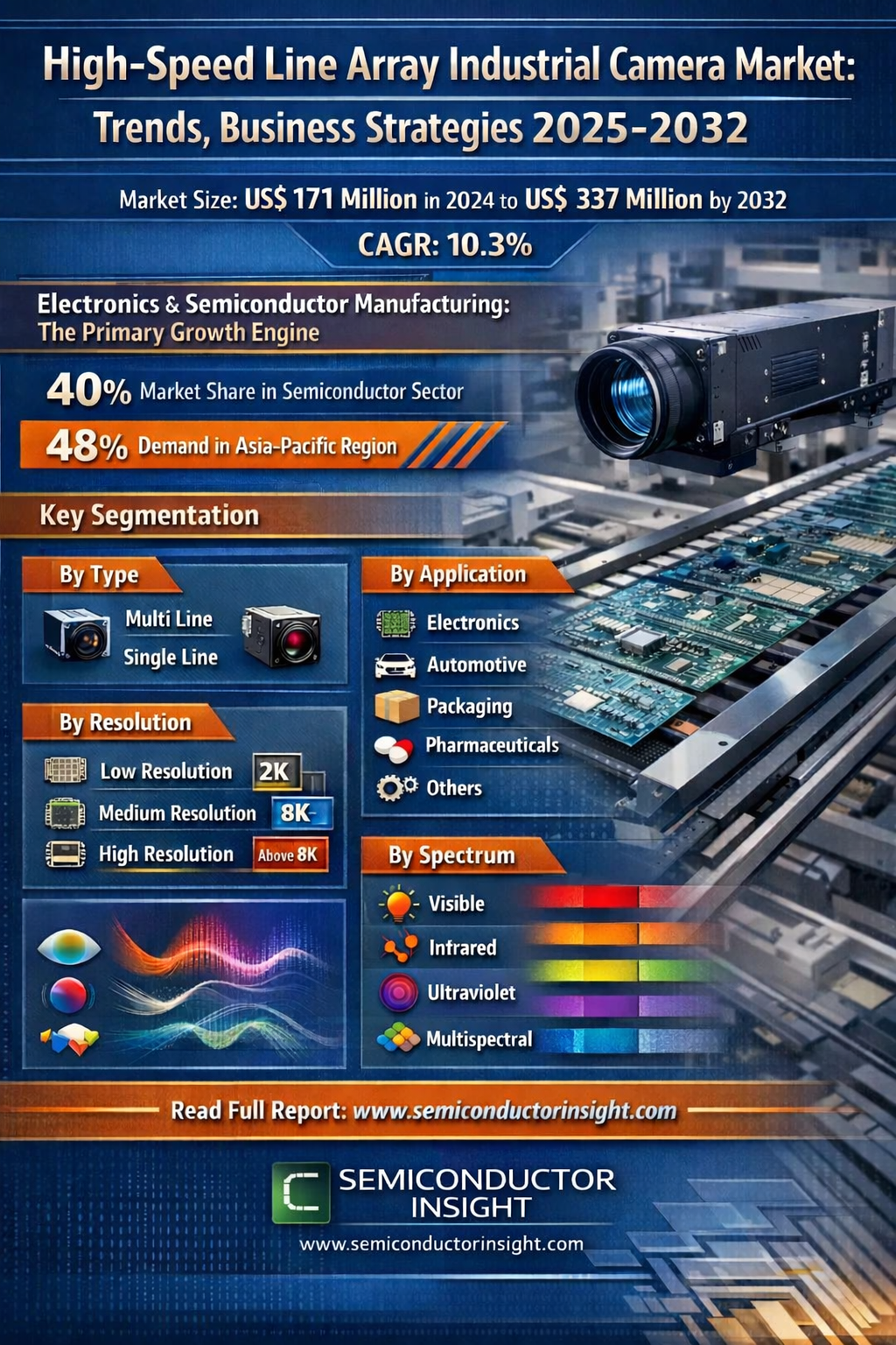High-Speed Line Array Industrial Camera Market, valued at a robust US$ 171 million in 2024, is on a trajectory of significant expansion, projected to reach US$ 337 million by 2032. This growth, representing a compound annual growth rate (CAGR) of 10.3%, is detailed in a comprehensive new report published by Semiconductor Insight. The study highlights the critical role of these specialized imaging devices in ensuring precision and efficiency within high-speed manufacturing and quality control processes, particularly in the electronics and semiconductor sectors.