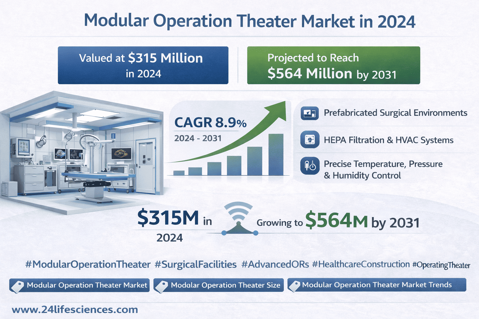 According to a newly published market research report by 24LifeSciences, global modular operation theater market was valued at USD 315 million in 2024 and is projected to reach USD 564 million by 2031, growing at a compound annual growth rate (CAGR) of 8.9% during the forecast period 2024–2031.