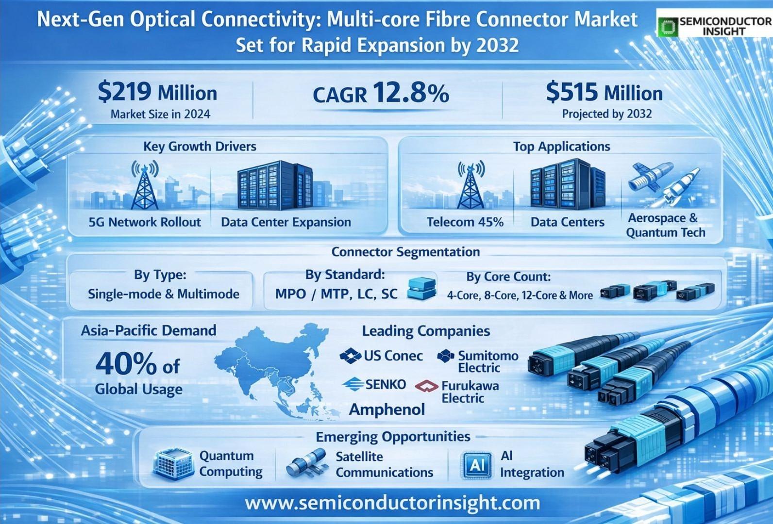 Global Multi-core Fibre Connector Market, valued at a robust US$ 219 million in 2024, is on a trajectory of significant expansion, projected to reach US$ 515 million by 2032. This growth, representing a compound annual growth rate (CAGR) of 12.8%, is detailed in a comprehensive new report published by Semiconductor Insight. The study highlights the critical role of these specialized connectivity solutions in enabling high-bandwidth data transmission across telecommunications, data centers, and emerging technological applications.