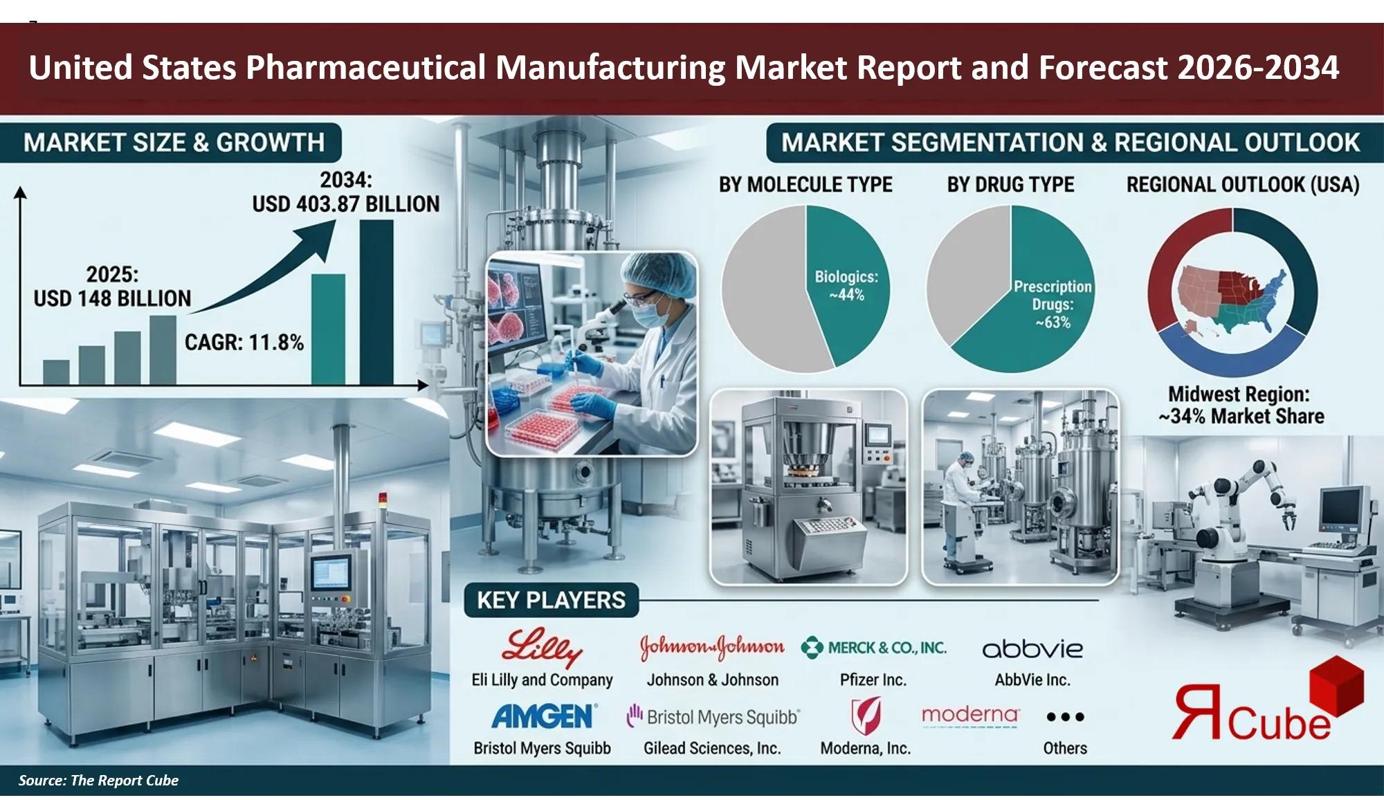 According to recent research report by The Report Cube, the size of United States Pharmaceutical Manufacturing Market was nearly USD 148 Billion in 2025, and by 2034 it is expected to reach around USD 403.87 Billion with a CAGR of 11.8% over the forecast period (2026-2034).