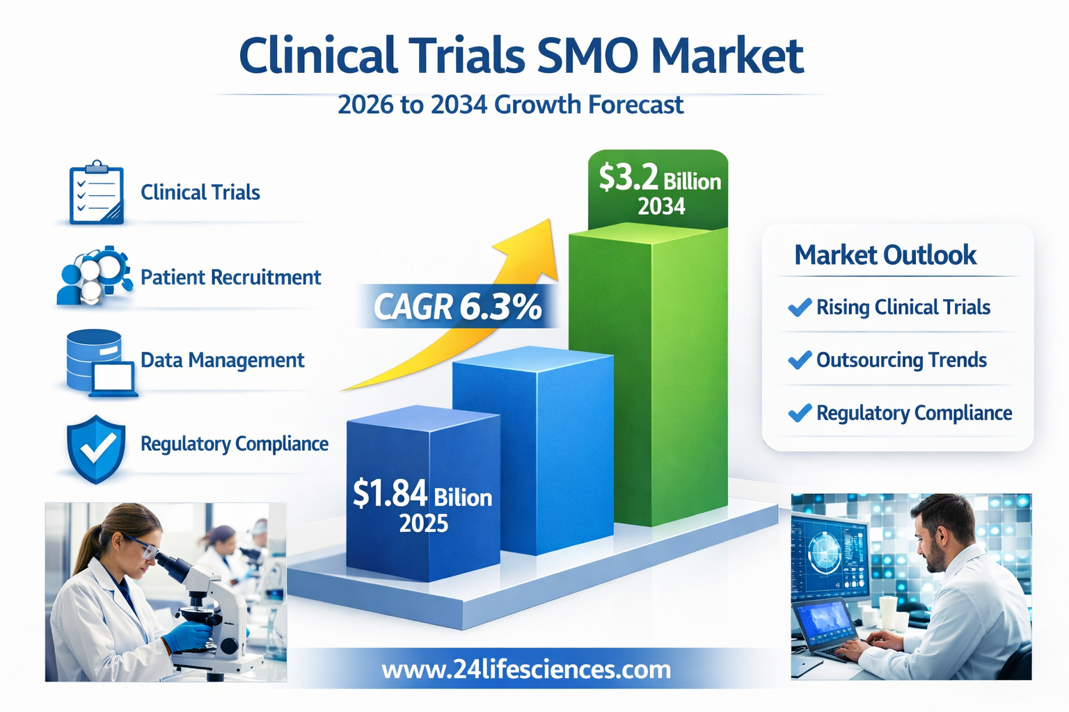 According to a newly published market research report by 24LifeSciences, global Clinical Trials Site Management Organizations (SMO) market was valued at USD 1.84 billion in 2025 and is projected to reach USD 3.2 billion by 2034, growing at a compound annual growth rate (CAGR) of 6.3% during the forecast period 2026–2034.
