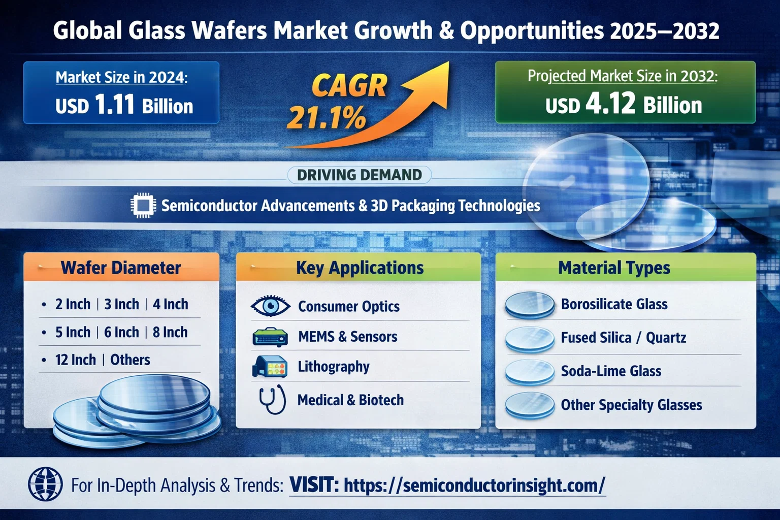 Global Glass Wafers Market, valued at USD 1.11 billion in 2024, is on a trajectory of aggressive expansion, projected to reach USD 4.12 billion by 2032. This expansion, driven by a compound annual growth rate (CAGR) of 21.1%, is detailed in a comprehensive new report published by Semiconductor Insight. The study underscores the indispensable function of these ultra-pure, precise substrates in enabling next-generation technologies, particularly in semiconductor fabrication and advanced optics.
