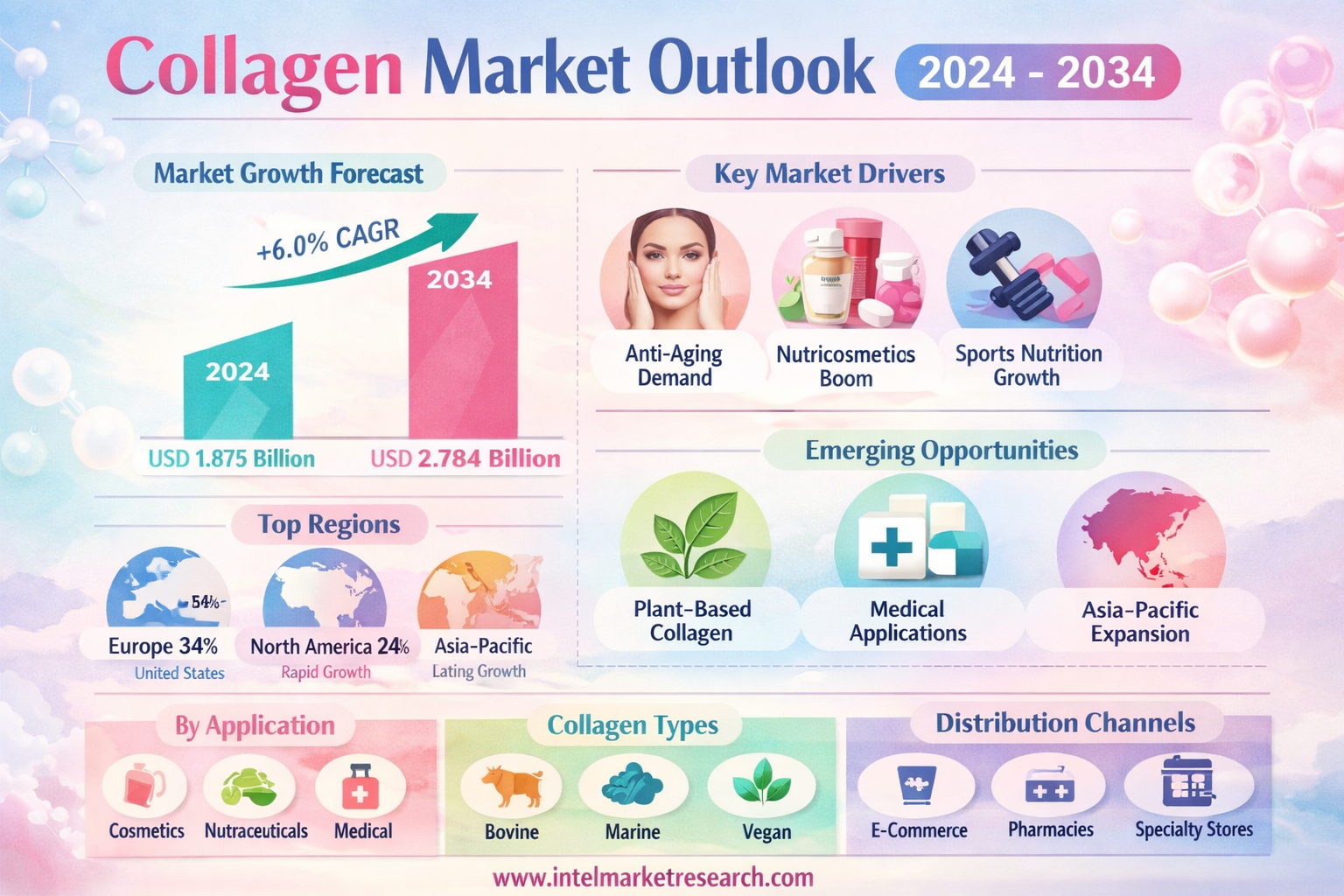 According to a new report from Intel Market Research, the global collagen market was valued at USD 1.875 billion in 2024 and is projected to reach USD 2.784 billion by 2034, growing at a steady CAGR of 6.0% during the forecast period (2025-2034). This growth is driven by increasing consumer awareness of collagen's health benefits, expanding applications in nutraceuticals and cosmetics, and rising demand for anti-aging solutions worldwide.