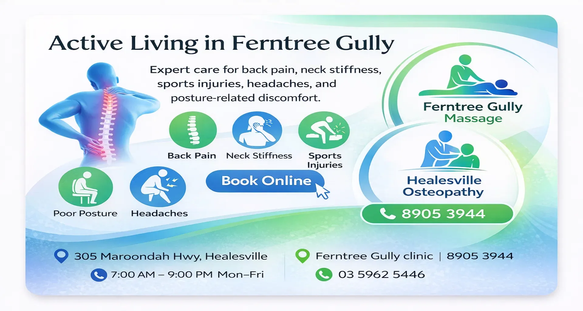 #HealesvilleOsteopathy #FerntreeGullyOsteopathy #PainRelief #OsteopathyCare #BackPain #PostureCorrection #InjuryRecovery #Wellness #RapidRecoveryClinic