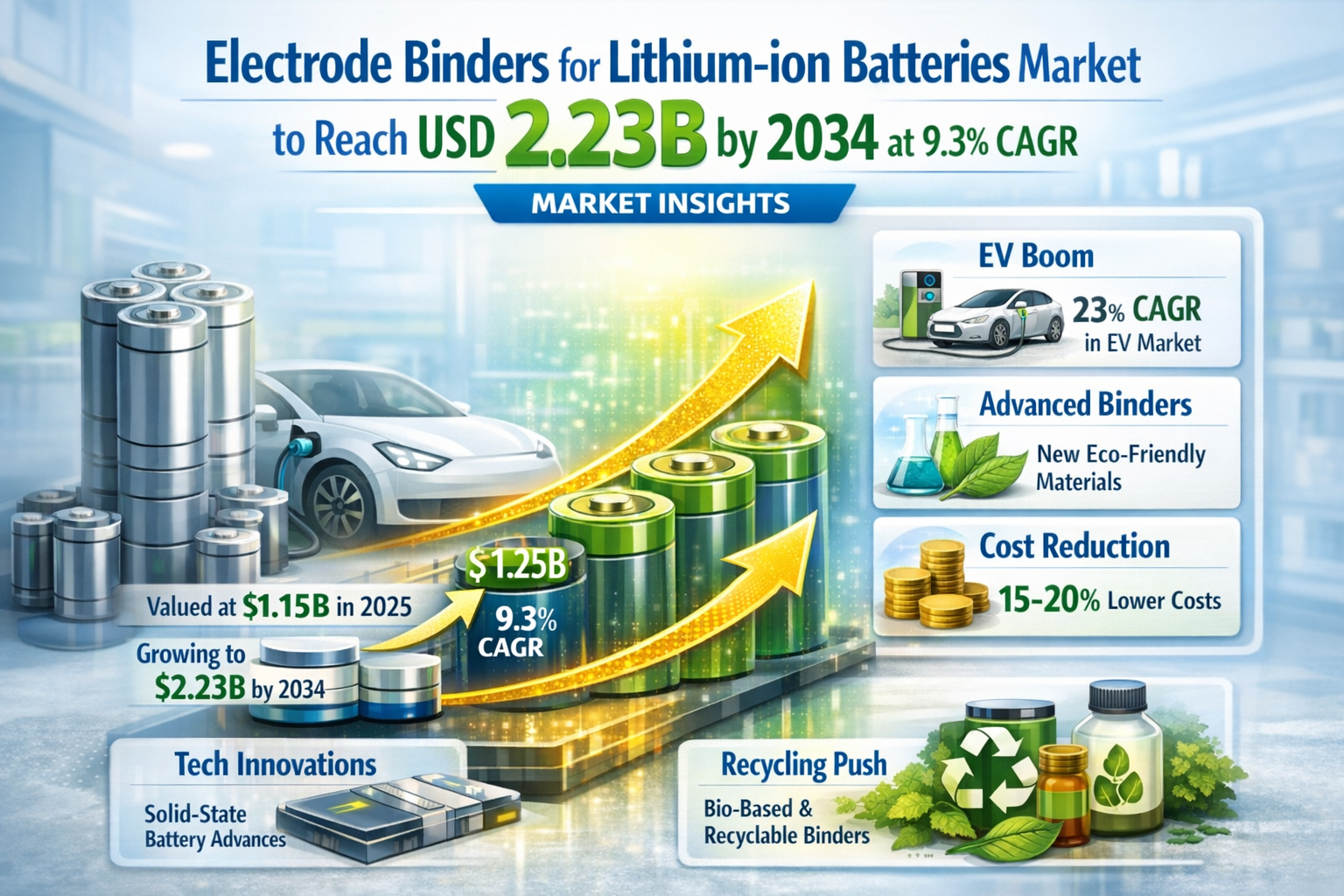 Electrode Binders for Lithium-ion Batteries Market to Reach USD 2.23B by 2034 at 9.3% CAGR