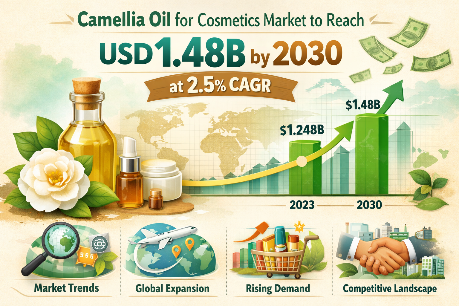 Camellia Oil for Cosmetics Market to Reach USD 1.48B by 2030 at 2.5% CAGR