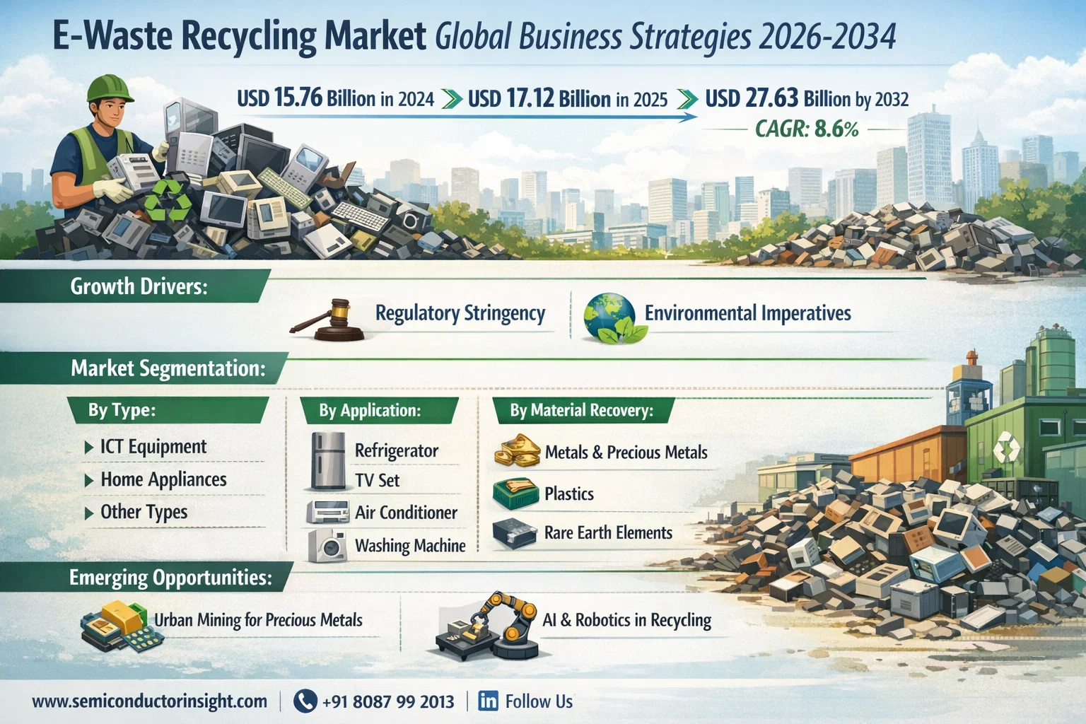 E-waste Recycling Market, valued at a robust USD 15.76 billion in 2024, is poised for substantial growth, projected to increase from USD 17.12 billion in 2025 to USD 27.63 billion by 2032. This expansion, reflecting a compound annual growth rate (CAGR) of 8.6%, is detailed in a comprehensive new report from Semiconductor Insight. The study emphasizes the pivotal role of responsible electronic waste management in addressing environmental challenges and recovering valuable materials critical for a circular economy.