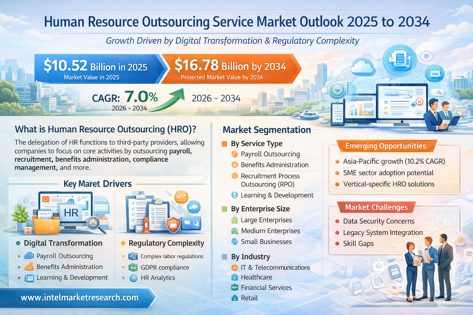 According to a new report from Intel Market Research, the global Human Resource Outsourcing Service market was valued at USD 10.52 billion in 2025 and is projected to reach USD 16.78 billion by 2034, growing at a steady CAGR of 7.0% during the forecast period (2026-2034). This expansion is fueled by increasing corporate demand for operational efficiency, complex regulatory environments, and the digital transformation of HR functions.