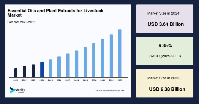 The global essential oils and plant extracts for livestock market size was valued at USD 3.64 billion in 2024 and is estimated to grow from USD 3.84 billion in 2025 to reach USD 6.38 billion by 2033, growing at a CAGR of 6.35% during the forecast period (2025–2033).