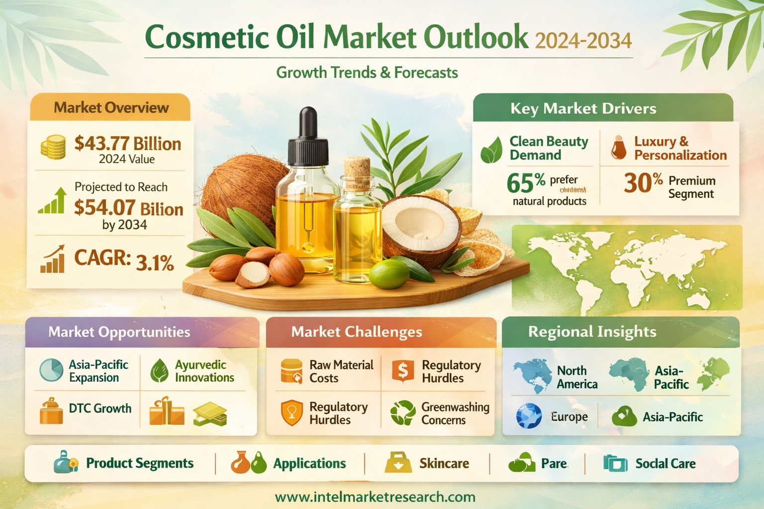 According to a new report from Intel Market Research, the global cosmetic oil market was valued at USD 43.77 billion in 2024 and is projected to reach USD 54.07 billion by 2034, growing at a steady CAGR of 3.1% during the forecast period. This expansion is driven by rising consumer demand for natural beauty solutions, technological innovations in formulation, and expanding applications across skincare and haircare segments.